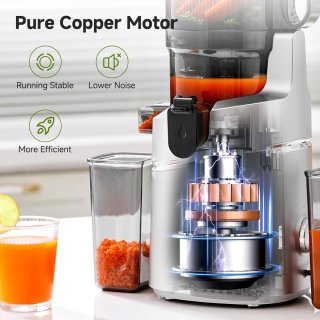 De stille motor zorgt ervoor dat juicen vroeg in de ochtend of later op de avond geen overlast geeft — een functionele eigenschap die in veel reviews vaak wordt onderschat. De motor van 250 W is voldoende voor de meeste fruit- en groentecombinaties en levert samen met de slowjuicemethode een hoge sapopbrengst en betere smaak. Het drievoudige filtersysteem is technisch interessant: het levert helderder sap met minder pulp, wat vooral fijn is voor mensen die de voorkeur geven aan een gladde textuur zonder grove vezels.